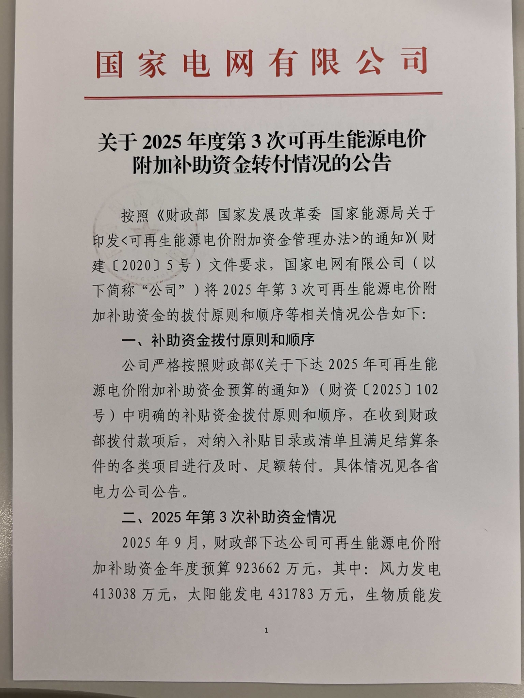 根据公告,2025年9月,财政部下达公司可再生能源电价附加补助资金年度预算923662万元,其中:风力发电413038万元,太阳能发电431783万元,生物质能发电78841万元。