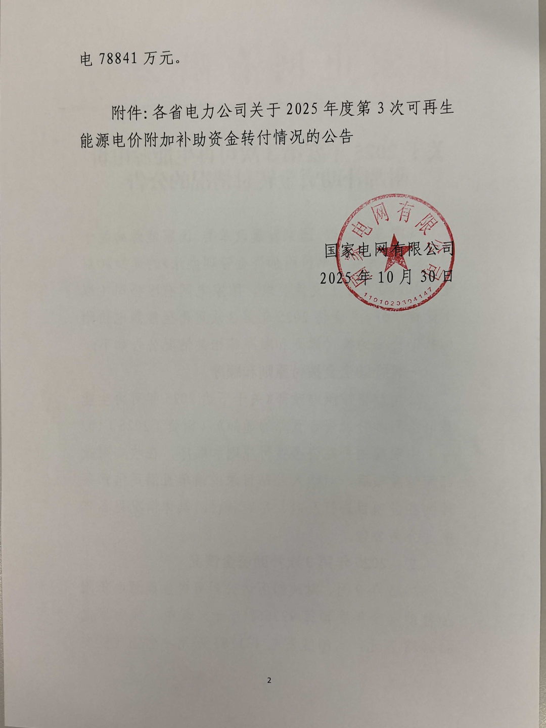 11月2日,国网新能源云发布国家电网有限公司关于2025年度第三次可再生能源附加补助资金转付情况的公告,总金额为92.3662亿元。今年以来,国家电网已先后转付3次可再生能源发电补贴,总金额近740亿元。