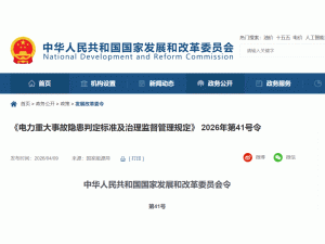 4月9日,国家发改委发布《电力重大事故隐患判定标准及治理监督管理规定》。 本规定适用于电力领域重大隐患的判定、排查治理及监督管理。自2026年7月1日起施行。