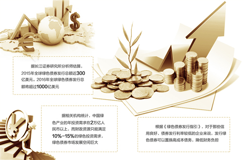 绿色债券市场空间巨大 近年来,国际绿色债券市场规模成倍增长。穆迪投资者服务公司日前发布报告称,2015年是2007年绿色债券首次问世以来发行量最高的一年,而2016年有望获得更大突破。据长江证券研究所分析师估算,2015年全球绿色债券发行总额近300亿美元。2016年全球绿色债券发行总额将超过1000亿美元。按照马骏的预测,2016年,中国绿色债券发行量可能占据世界“半壁江山”。