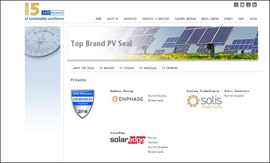 2016年2月,欧洲权威调研机构EuPD授予“全球组串式光伏逆变器专家”宁波锦浪新能源科技股份有限公司旗下“Solis”品牌“2016年度顶尖光伏逆变器品牌”称号,是截止2015年度至目前唯一一家组串式逆变器供应商。 EuPD调研机构在欧洲光伏产业中享有盛誉,致力于提供可持续发展的行业和服务供应商的权威市场情