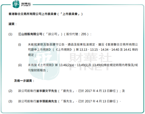 5月14日,江山控股在港交所发布一则名为「江山控股有限公司(股份代号:295)及其七名现任及前董事被谴责,违反《上市规则》及《董事承诺》」的公告。
