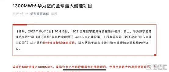 华为不在A股,却俨然A股带头大哥的模样。稍微一点风吹草动,总是引来相关概念股一片异动。何况是签约1300兆瓦时这一迄今全球最大规模储能项目——沙特红海新城储能项目——这样的大动作。