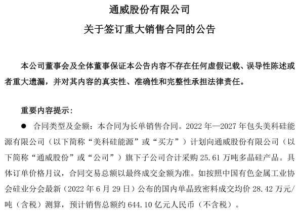 7月1日晚间,通威股份公告,公司旗下四家子公司于近日与美科硅能源签订多晶硅长单销售合同,美科硅能源在2022年-2027年预计向公司合计采购25.61万吨多晶硅产品,预计销售总额约644.1亿元。
