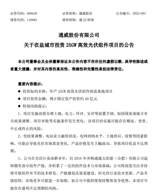 9月22日,通威股份发布公告称,拟在盐城市投资25GW高效光伏组件项目,预计固定资产投资约40亿元。