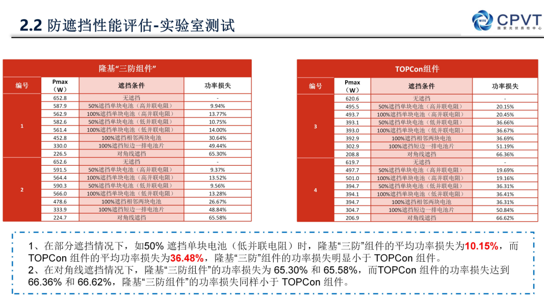 结果显示,“三防”组件在模拟鸟粪和积灰遮挡的情况下,功率损失较TOPCon组件降低6%,在模拟电线杆等斜对角遮挡的情况下,功率损失较TOPCon组件降低10%。