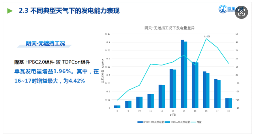特别值得强调的是,在阴天无遮挡工况下,隆基HPBC 2.0的组件较TOPCon单瓦增益达到了1.96%,其中在16~17时增益最大,达到了4.42%。