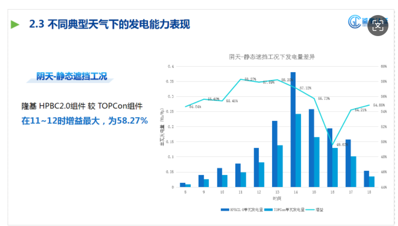 在阴天有遮挡工况下,HPBC 2.0的组件较TOPCon组件在11~12时的增益更是高达58.27%。