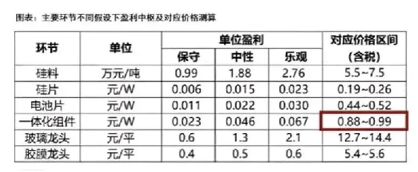 去年12月,光伏行业年度大会上,国金证券分析师提供的表格显示,明年组件的价格预计要上涨到0.88-0.99元/W,才能到达成本线。据国金证券推算,若各环节回归合理利润,组件价格很可能站稳0.9元/W,甚至向1元/W迈进。