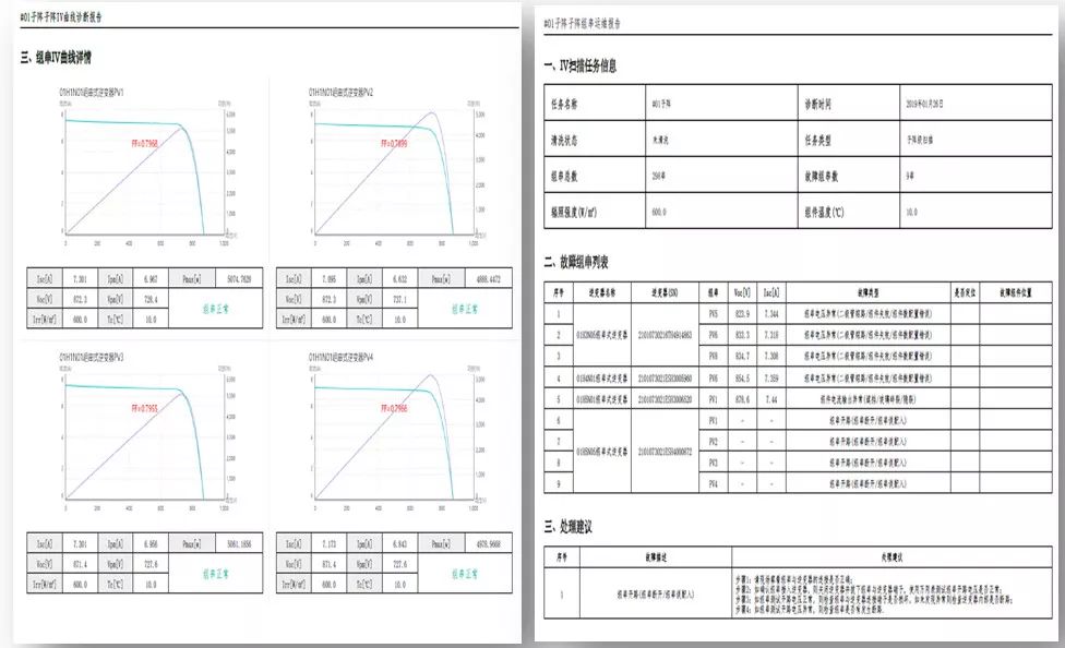 山西大同某50MW山地光伏电站,使用智能IV诊断扫描14626串组件,检测出909串故障组串,故障率: 6.21%。运维人员根据智能IV诊断报告,有目的上站维护,故障修复预估挽回损失542万/20年。