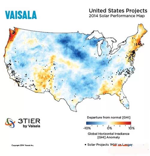 首先是糟糕的天气。下图可见,加州南部和内华达州2014年的辐照水平与过去15年的平均数据相比产生了很大的偏离。Ivanpah项目位于加州南部靠近内华达的边界位置,正好是在地图中的蓝色部分。
