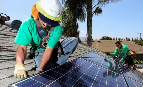 太阳城公司的工人为加州的一个家庭安装太阳能电池板。该公司表示最新产品的能源转化率提升到了新的高度。