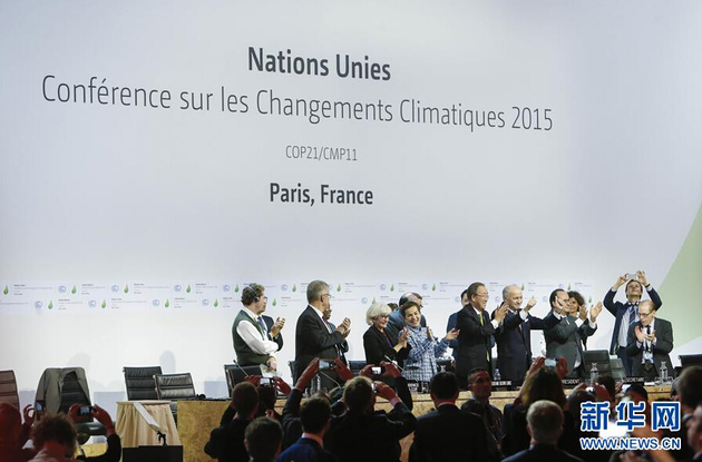 12月12日,在法国巴黎北部市郊的布尔歇展览中心,法国外交部长、巴黎气候变化大会主席法比尤斯(右五)、法国总统奥朗德(右四)与联合国秘书长潘基文(右六)在巴黎气候变化大会上庆祝巴黎气候协议的达成。巴黎气候变化大会12日晚通过全球气候变化新协议。协议将为2020年后全球应对气候变化行动作出安排。 新华社记者 周磊 摄 为了应对日益严峻的全球气温升高趋势,实现人类的可持续发展,巴黎大会在历时十余天后,终于达成了协议。