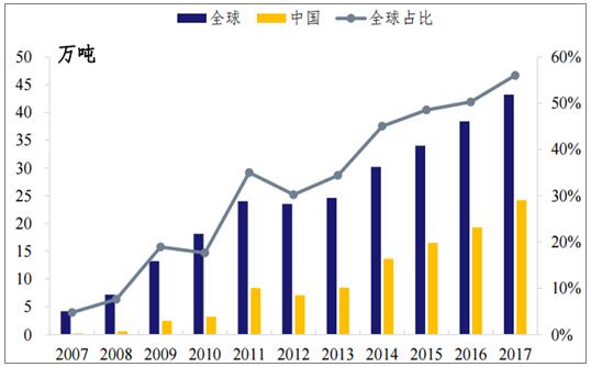 2017年全球多晶硅料有效产能50万吨,同比增长9.4%,新增产能6.6万吨全部来自中国。