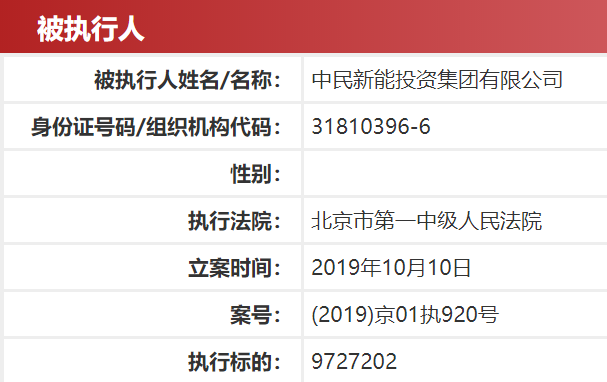 新京报记者自全国法院执行信息平台获悉,中民新能投资集团有限公司已经在近日被北京市第一中级人民法院列为被执行人,案号(2019)京01执920号,立案时间2019年10月10日,执行标的“9727202”。
