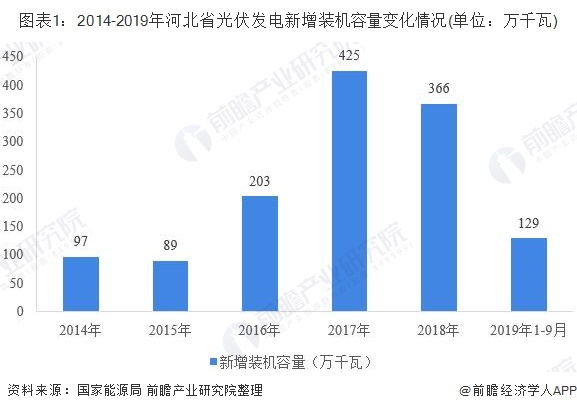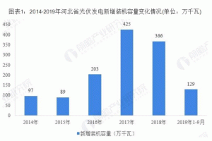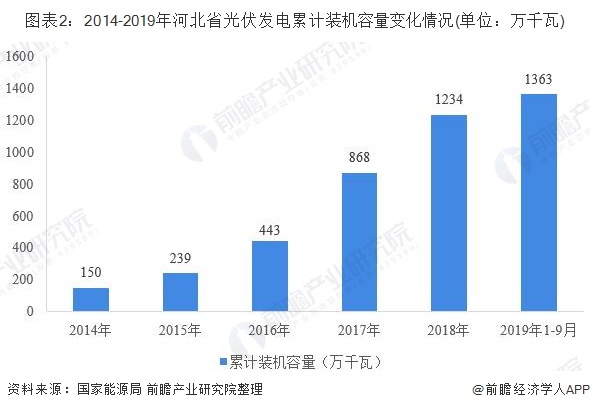 据国家能源局统计数据显示,2014年,河北省累计装机容量仅150万千瓦,到2018年,全省光伏发电累计装机容量突破1000万千瓦,达到1234万千瓦,同比增长42.2%。从增长速度来看,2014-2015年,江苏省光伏发电新增装机容量均在100万千瓦以下水平,到2016-2018年,增长迅速,2018年达到366万千瓦,同比下降13.9%。截至2019年第三季度,全省光伏发电新增装机容量为129万千瓦,累计装机容量达到1363万千瓦。排名全国第三位,仅次于山东和江苏。