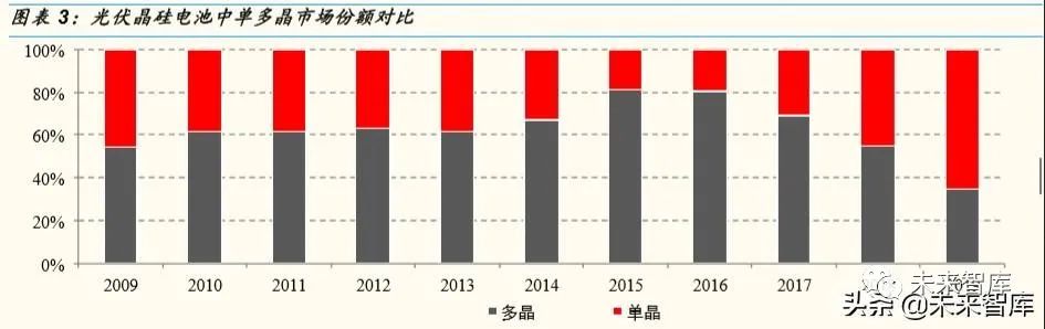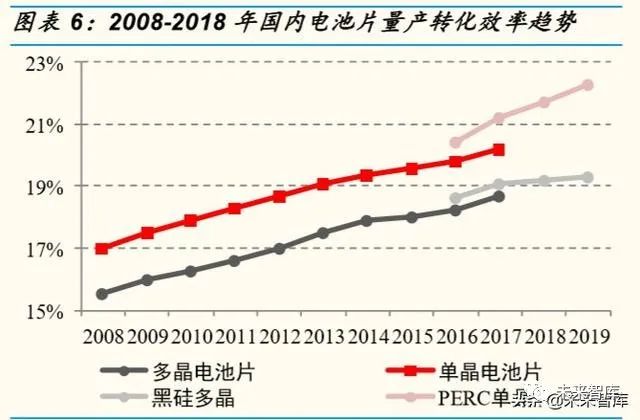 2)这种变化能带来产品性价比的“显著”提升,使理论投资回收期大 幅缩短,令终端客户愿意为此承担一定风险。典型代表如金刚线切割 工艺、PERC 电池技术的引入,以及由此引发的单晶替代多晶的大潮, 这也是近年来光伏行业内唯一真正称得上成功“颠覆”、并对产业格局 产生重大影响的技术与产品变化。