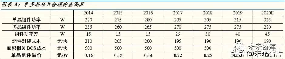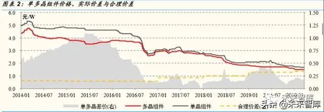在单晶价值被市场认可后,单晶市占率的提升速度主要由单晶硅片扩产速 度决定(2020 年之前单晶硅片供应整体偏紧)。2019 年下半年单多晶组件 价差缩小的原因是 1)多晶组件价格已接近现金成本,降无可降;2)单晶 组件需提升相对性价比才能在土地等面积相关成本更低地区替代多晶组件。