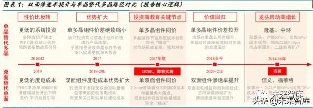 我们认为,双面组件对单面组件的替代逻辑,将与单晶替代多晶有一定相 似性。回顾分析单多晶替代过程,我们判断双面组件即将迎来渗透率的快 速提升,而光伏玻璃将是双面组件普及的最大获益者。此外,光伏玻璃行 业本身的竞争格局、行业特点也与当年的单晶硅片环节呈现一定相似性。我们判断当前的光伏玻璃类似 2016 年的单晶硅片,光伏玻璃龙头信义、 福莱特(10.790, -0.28, -2.53%)有望复制单晶龙头隆基、中环成功之路,在未来 2~3 年内享受行业 增长、双面渗透率提升、市占率提升三重增速叠加带来的持续高增长。