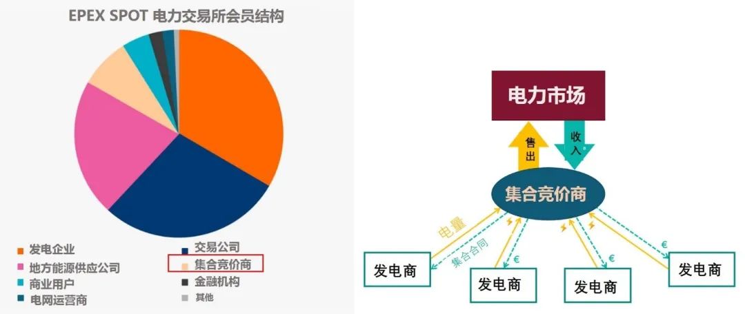 EPEX SPOT交易所目前约有300名会员参与交易,大致可以分为发电企业,金融机构,用户,电网运营商,和集合竞价商Aggregator等。交易所一般都设定一定的准入条件,而集合竞价商的引入,便利了小型可再生能源发电商参与电力交易,作为他们的代理,协助如小型风电场在市场售电和管理平衡成本风险。