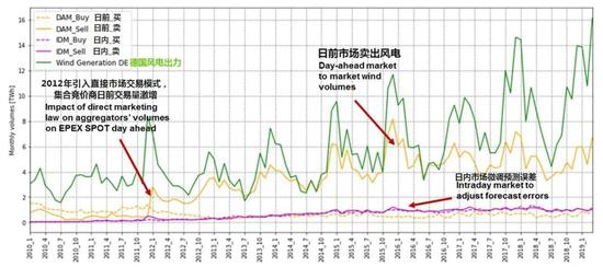 电力市场也不断发展,来更好的适应波动性较大的可再生能源发电量的逐渐增加。除日前市场外,日内交易市场近年来逐渐活跃,交易产品种类也从拍卖和小时合约扩展到更细分的15分钟和30分钟交易,使得市场参与者能够在实时电力平衡前最大限度的调整风电和光伏出力的预测误差。