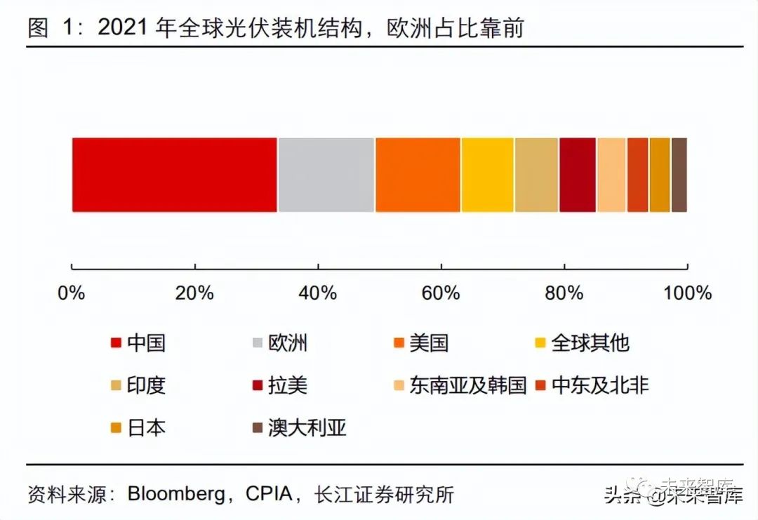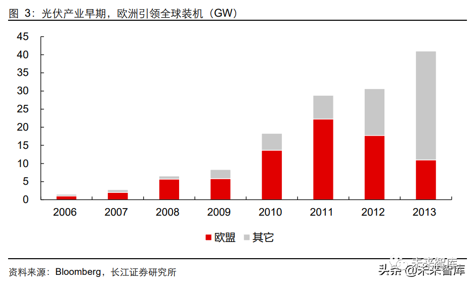 光伏起步极早,引领行业初成。欧洲市场发展极早,2012 年之前在需求端和制造端是 全球光伏发展重心。2011 年欧盟光伏装机 22.3GW,占全球 77%,规模上仅次于十年 之后的 2021 年。