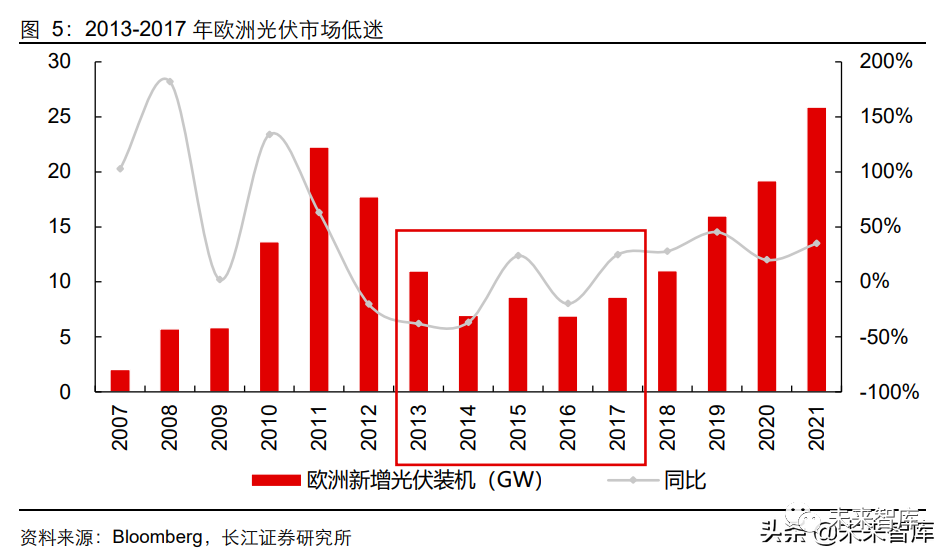 2013-2017 年,双反及 MIP 政策限制了中国光伏组件向欧盟的出口,并导致欧洲市场装 机成本高于行业,装机需求进入低迷期。这一阶段欧洲每年光伏新增装机仅 6-11GW。