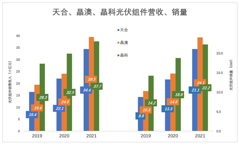 2021年,晶澳、天合光伏组件产量分别为25.8GW、26.2GW(销量21.1GW),均高于晶科。