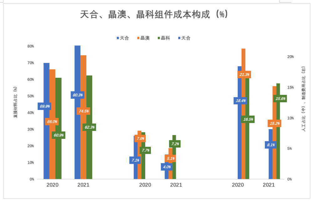 天合直接材料成本占比最高,晶科总能拿到相对最低的价格:2020年为69.9%,比晶科高9个百分点;2021年,天合直接材料占成本的80.3%、比晶科高8个百分点。