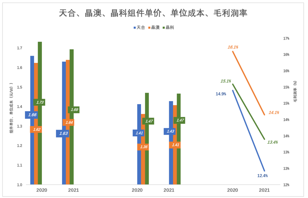 晶科光伏组件成本也是三家中最高的,2021年为1.47元/瓦,比天合高4分,比晶澳高6分。