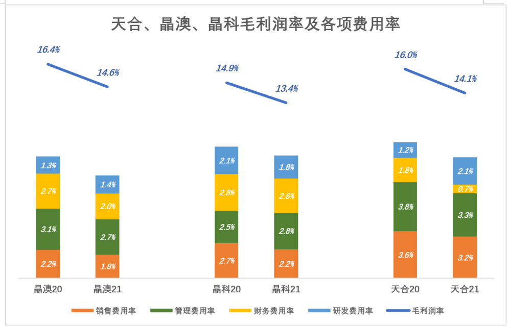 天合毛利润率下降最多,销售、管理、财务费用率合计压降1.8个百分点,毛利率稍强于晶澳,研发费率用提高了0.9个百分点。