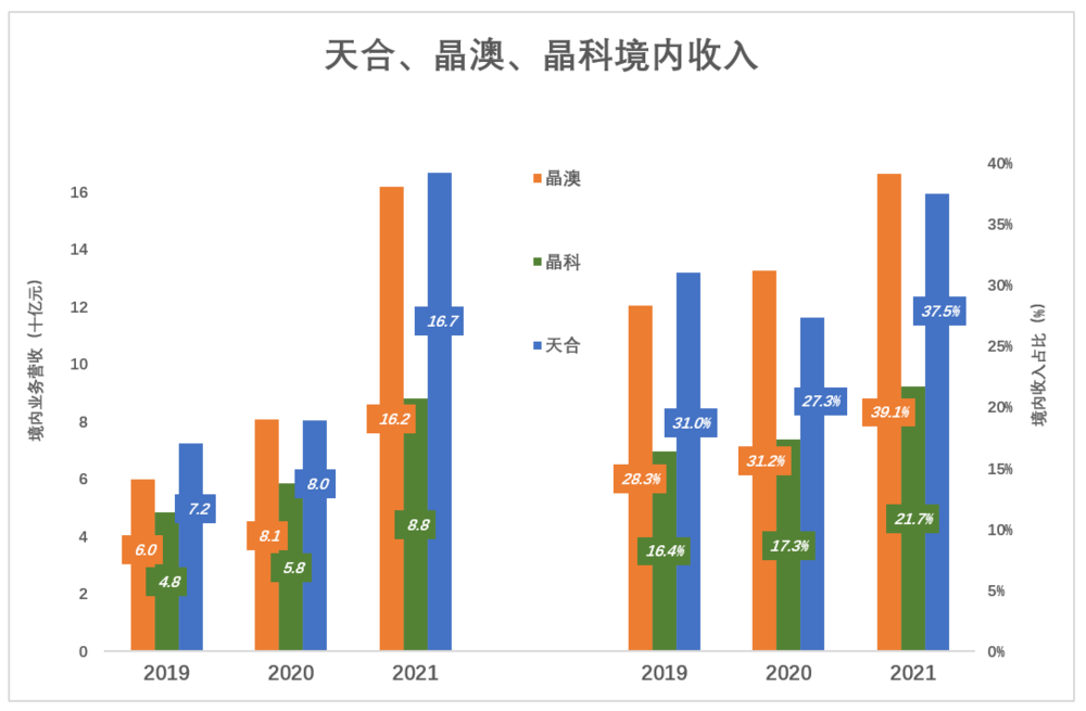 晶科在三家中最为“外向”——2021年境内收入88亿、仅占总收入的21.7%;晶澳、天合分别为162亿、167亿,占各自总收入的38.1%、37.5%。